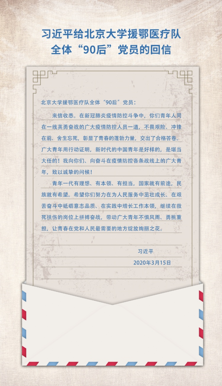 附:习近平给北京大学援鄂医疗队全体“90后”党员的回信全文