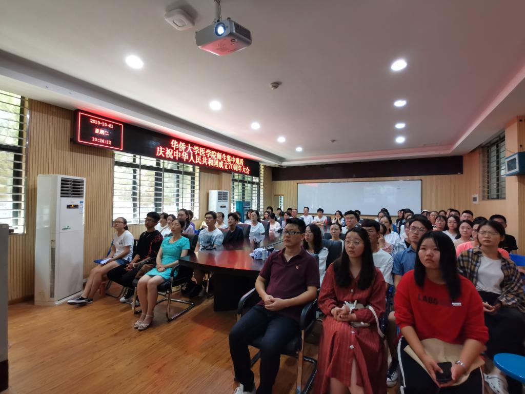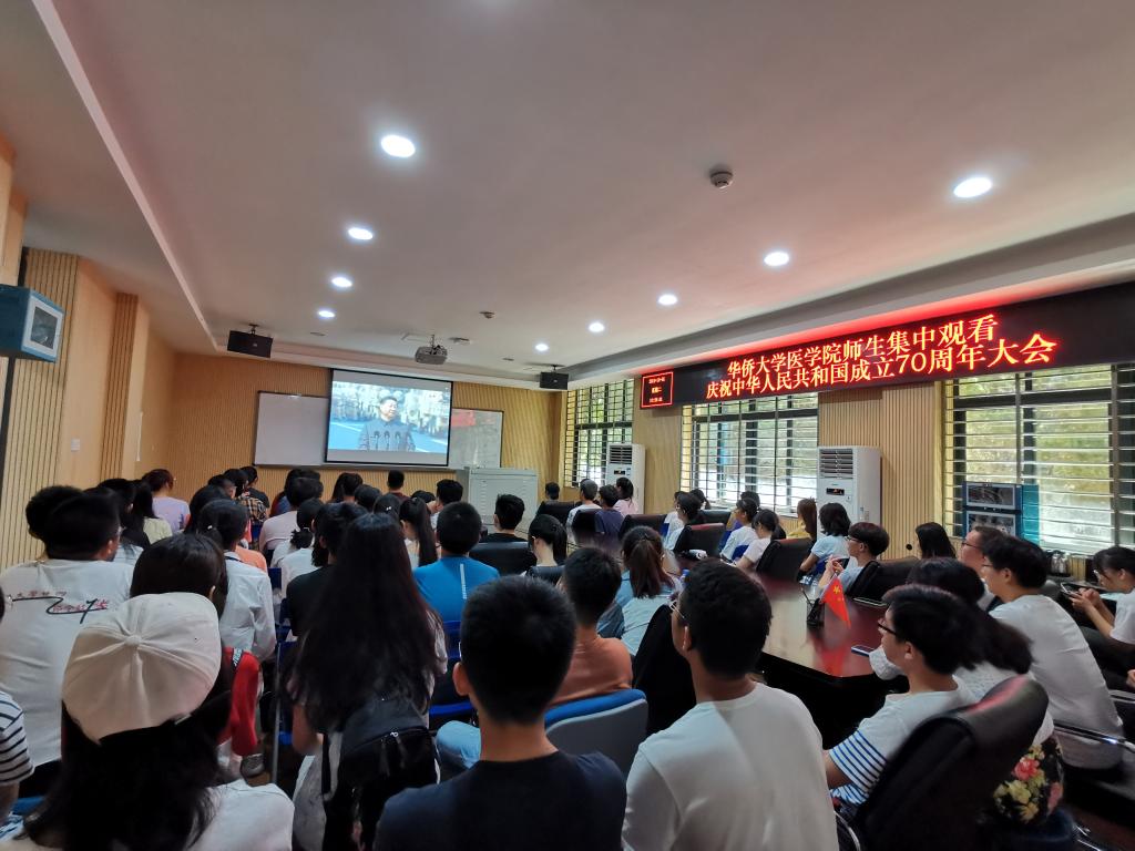 院长刁勇、党委副书记郑莉、团委书记张振岳以及2019级本科班主任成志云、辅导员周莹莹同团委、学生会、研究生会同学们一起在胜骏楼228会议室收看庆祝中华人民共和国成立70周年大会直播。