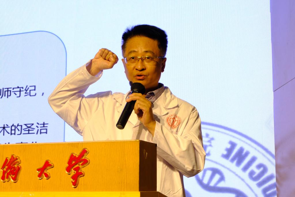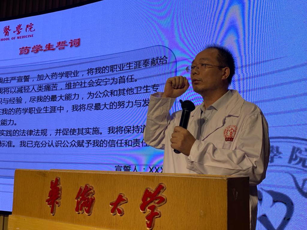 “我将以减轻人类痛苦,维护社会安宁为首任……我将尽最大的努力与发展同步,保持专业能力。” 在李招发副院长带领下,2019级药学专业学生进行宣誓。2019级全体临床医学专业的新生也跟随董少良副院长立下“健康所系,性命相托”的医学生誓言。